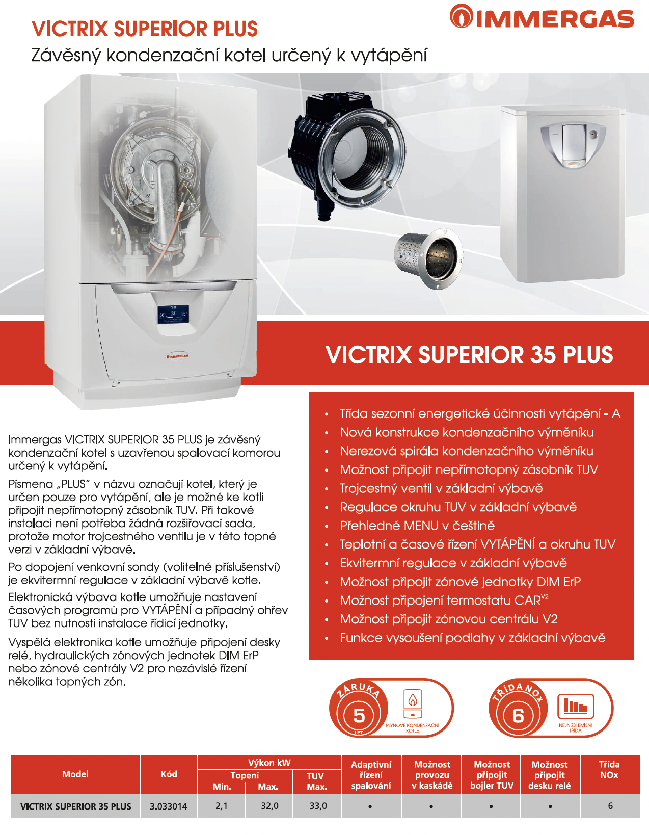 Immergas VICTRIX SUPERIOR 35 PLUS je nástěnný kondenzační kotel se systémem adaptivního řízení spalování o tepelných výkonech 2,1 - 32,0 kW v režimu vytápění a 2,1 - 33,0 kW při ohřevu TUV, pokud je instalován nepřímotopný zásobník TUV.