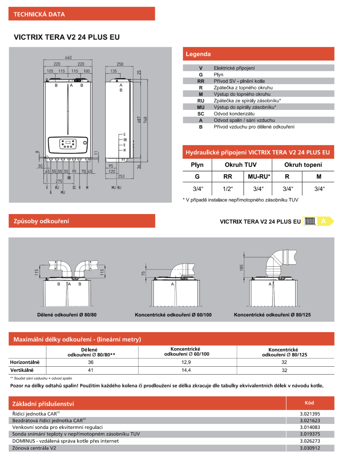 Immergas VICTRIX TERA V2 24 PLUS EU je nástěnný kondenzační kotel s uzavřenou spalovací komorou o tepelných výkonech 4,3 - 24,0 kW v režimu vytápění a 4,3 - 28,0 kW při ohřevu TUV, pokud je instalován nepřímotopný zásobník TUV. Kotel je určen k vytápění s možností ohřevu TUV v nepřímotopném zásobníku.