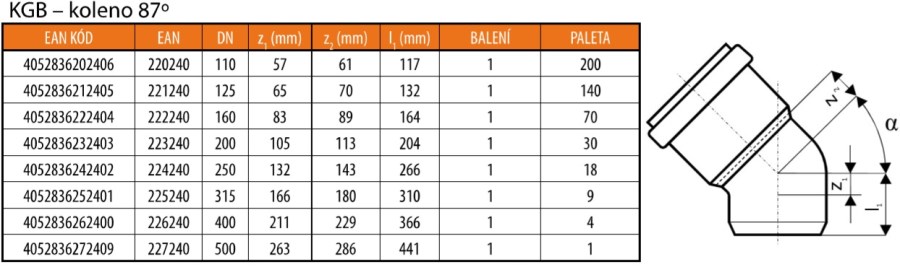 KG KGB koleno odpadní DN500, 87°, PVC, oranžová