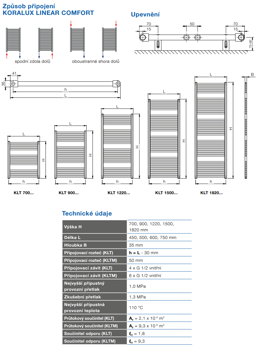 Trubková otopná tělesa KORALUX LINEAR COMFORT jsou vyrobena z uzavřených ocelových profilů s průřezem ve tvaru “D” a rovných profilů s kruhovým průřezem. Rozteč připojení na otopnou soustavu je odvozena z délky otopného tělesa. Otopná tělesa jsou dodávaná se sadou pro upevnění na stěnu včetně odvzdušňovací a zaslepovací zátky. Barevné provedení radiátoru dle vzorníku barev.