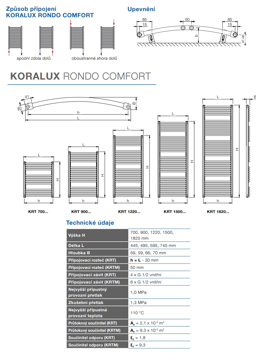 Trubková otopná tělesa KORALUX RONDO COMFORT jsou vyrobena z uzavřených ocelových profilů s průřezem ve tvaru “D” a prohnutých profilů s kruhovým průřezem. Rozteč připojení na otopnou soustavu je odvozena z délky otopného tělesa. Otopná tělesa jsou dodávaná se sadou pro upevnění na stěnu včetně odvzdušňovací a zaslepovací zátky. Barevné provedení radiátoru dle vzorníku barev.