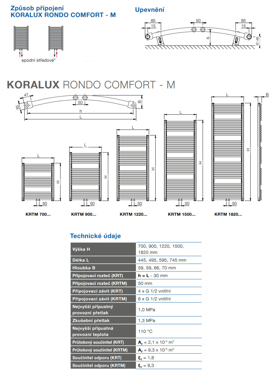 Trubková otopná tělesa KORALUX RONDO COMFORT – M jsou vyrobena z uzavřených ocelových profilů s průřezem ve tvaru “D” a prohnutých profilů s kruhovým průřezem. Těleso je upravené pro spodní středové připojení s připojovací roztečí 50 mm. Otopná tělesa jsou dodávaná se sadou pro upevnění na stěnu včetně odvzdušňovací a zaslepovací zátky. Barevné provedení radiátoru dle vzorníku barev.