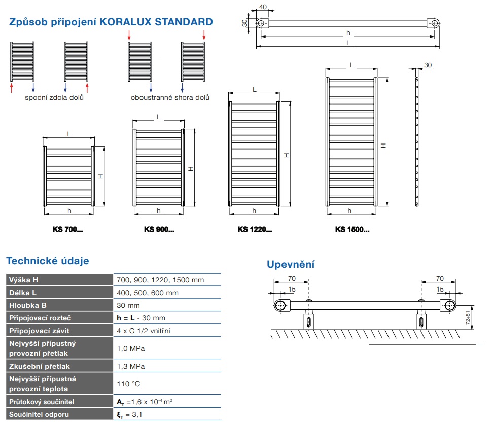 Trubková otopná tělesa KORALUX STANDARD jsou vyrobena z uzavřených ocelových profilů s průřezem ve tvaru “D” a rovných profilů s kruhovým průřezem. Rozteč připojení na otopnou soustavu je odvozena z délky otopného tělesa. Otopná tělesa jsou dodávaná se sadou pro upevnění na stěnu včetně odvzdušňovací a zaslepovací zátky. V této řadě naleznete i nejmenší trubkové otopné těleso na trhu, při šířce pouhých 40 cm je ideální do malých koupelen nebo jako alternativní těleso vhodné ke kombinaci s jiným druhem vytápění, např. podlahovým. Barevné provedení radiátoru dle vzorníku barev.