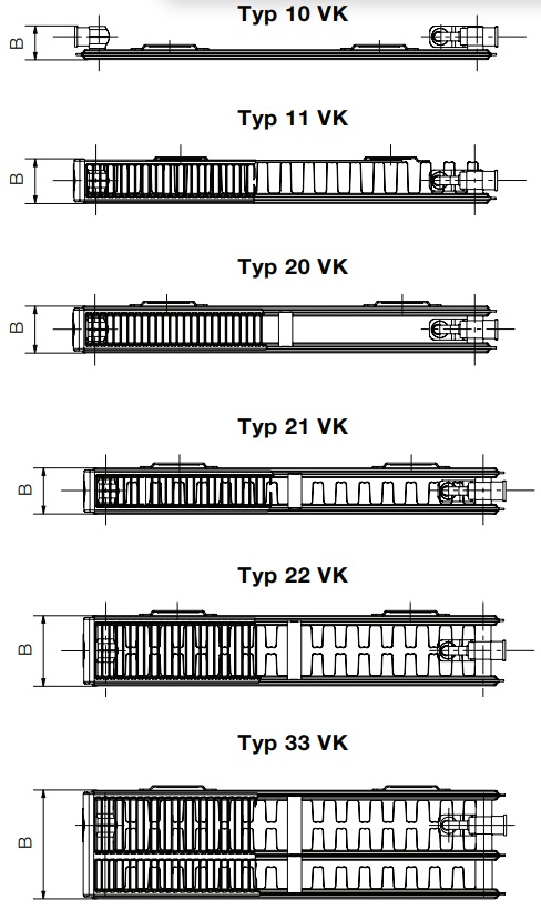 Model RADIK VK je deskové otopné těleso v provedení VENTIL KOMPAKT, které umožňuje pravé spodní připojení na otopnou soustavu s nuceným oběhem. Ze zadní strany jsou přivařeny dvě horní a dolní příchytky, otopná tělesa o délce 1800 mm a delší mají navařena šest příchytek.
