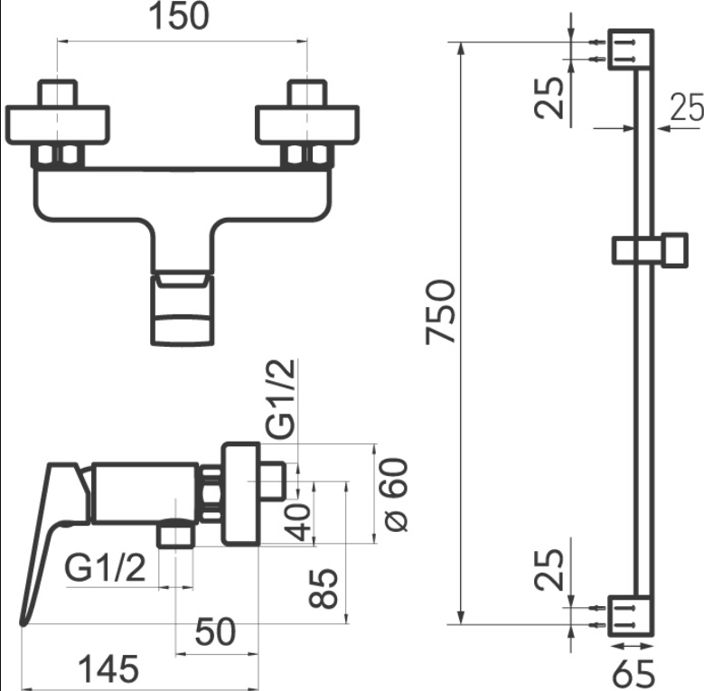 Koupelnová sada obsahuje kvalitní sprchovou soupravu s designovou sprchovou tyčí a velkým rozsahem nastavení výšky ruční sprchy.