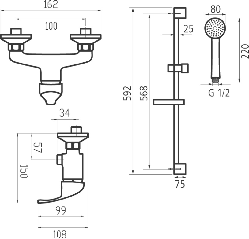 Koupelnová sada obsahuje i kit – sprchovou růžici, posuvný držák, kovovou hadici a praktickou mýdlenku.