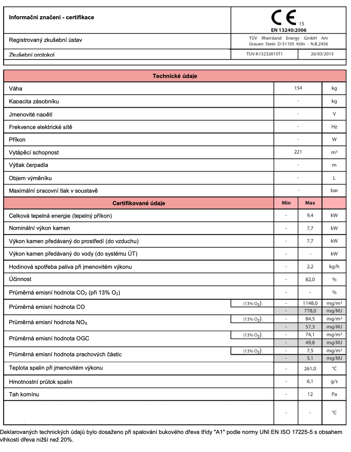 | Vytápěcí schopnost kamen: | 209 m3 |