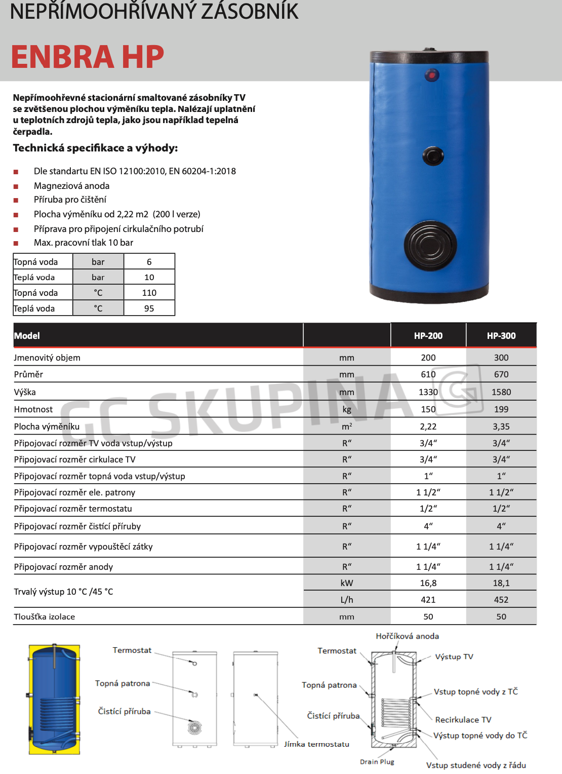 Ohřívač ENBRA HP TV 200 L pro tepelná čerpadla, výměník 2,22 m2