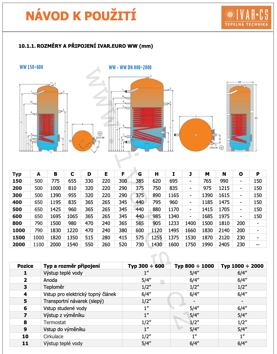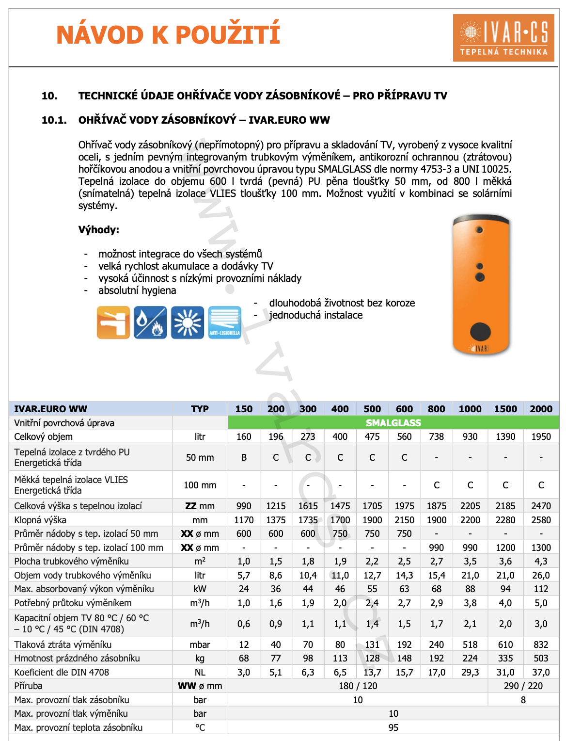 - max. provozní tlak zásobníku 10 bar (od objemu 1500 l pouze 8 bar)