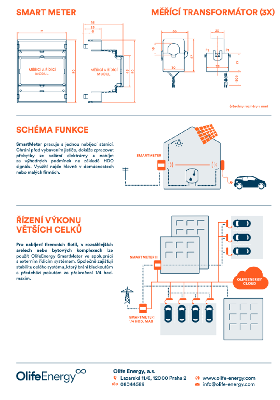 - OlifeEnergy SmartMeter řídí právě jednu nabíjecí stanici OlifeEnergy na jedné přípojce (jeden nebo dva nabíjecí body podle modelu nabíjecí stanice)