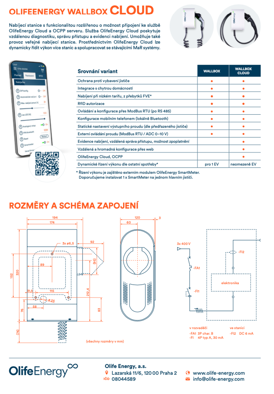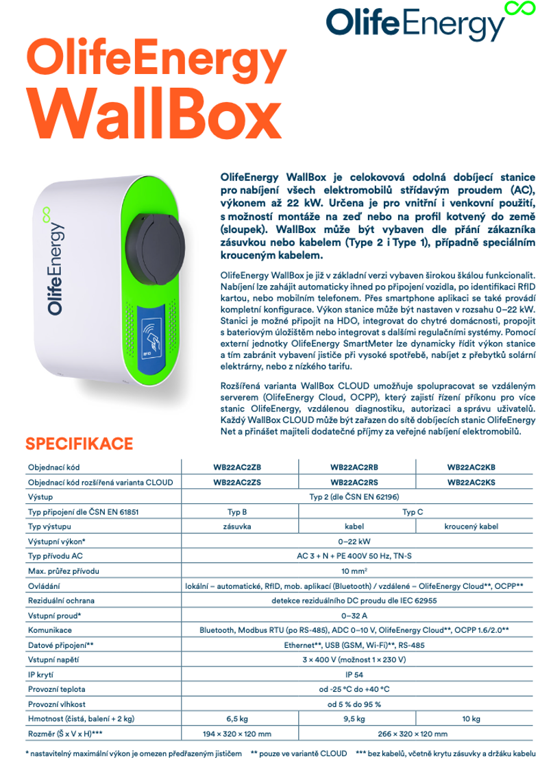 OlifeEnergy WallBox je celokovová odolná dobíjecí stanice pro nabíjení všech elektromobilů střídavým proudem (AC), výkonem až 22 kW. Určena je pro vnitřní i venkovní použití, s možností montáže na zeď nebo na profil kotvený do země (sloupek).