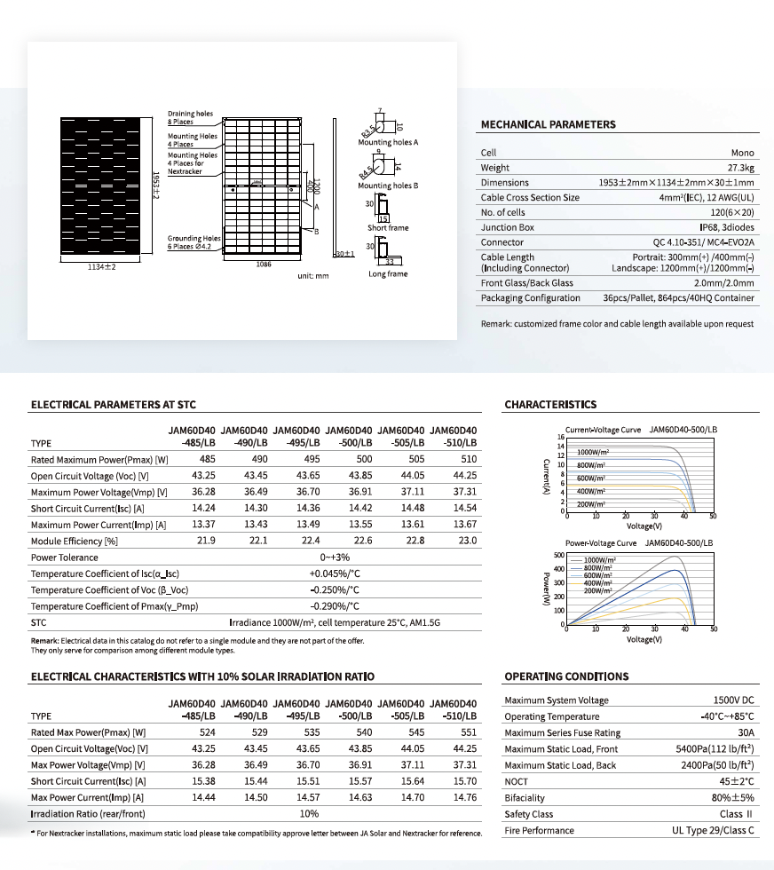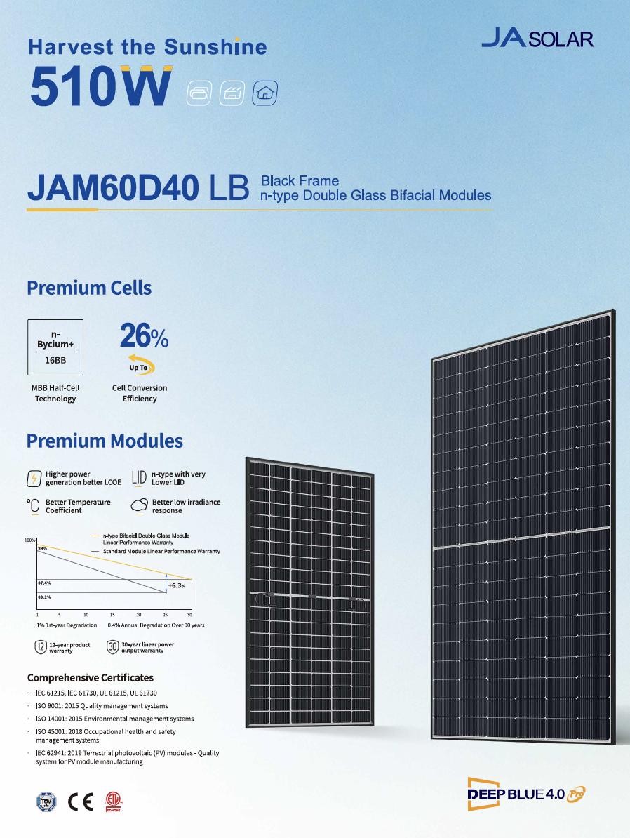 Fotovoltaický panel JA SOLAR JAM60D40-500/LB_BF je vysoce kvalitní 500W bifaciální modul využívající technologii článků typu N. Díky tomu poskytuje vyšší účinnost a životnost ve srovnání s tradičními panely.