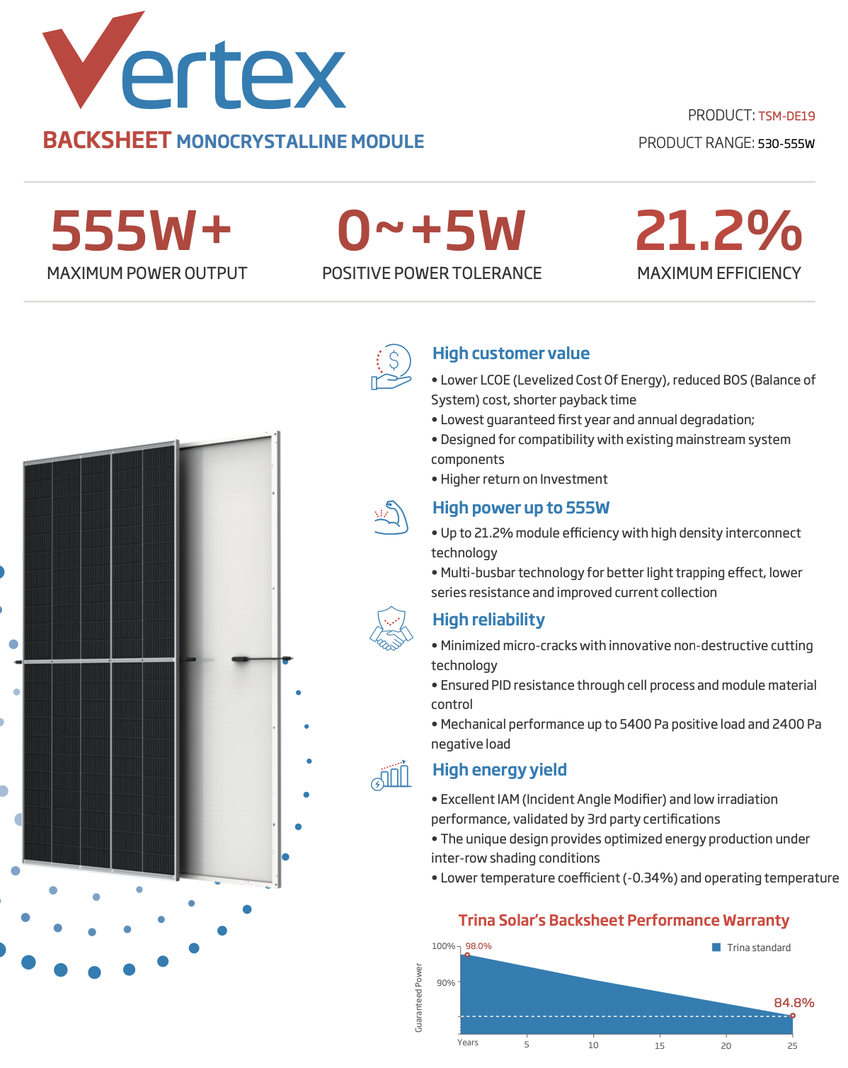Trina Solar je globální leader ve fotovoltaických a energetických řešeních. Zabývá se výzkumem, vývojem a výrobou solárních článků a modulů a chytrých monitorovacích systémů. Firma Trina Solar k červnu 2021 dodala více než 83 GWp v solárních panelech a umístila se na seznamu "Top 500 soukromých firem v Číně". Cílem firmy je zvětšit produkci elektřiny pomocí obnovitelných zdrojů a pokračovat ve vývoji špičkových fotovoltaických panelů.