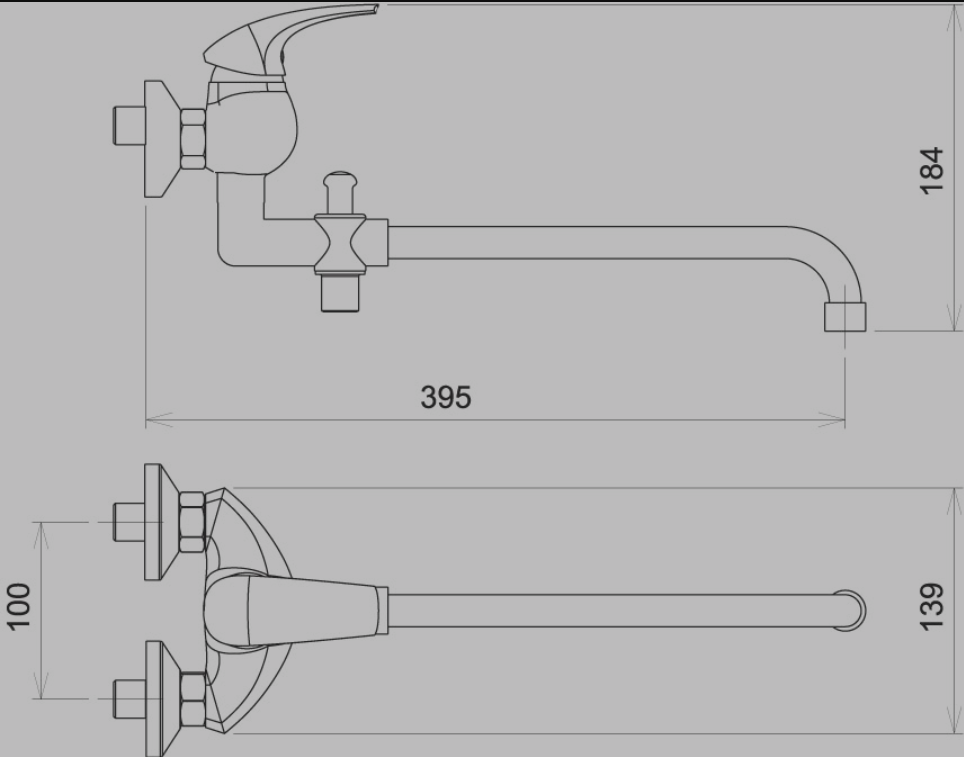 Paneláková nástěnná vanová baterie s roztečí 100 mm a výtokovým ramínkem s aretačním přepínačem v délce 360 mm.