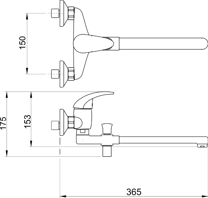 Paneláková nástěnná vanová baterie s roztečí 150 mm a výtokovým ramínkem s aretačním přepínačem v délce až 320 mm.