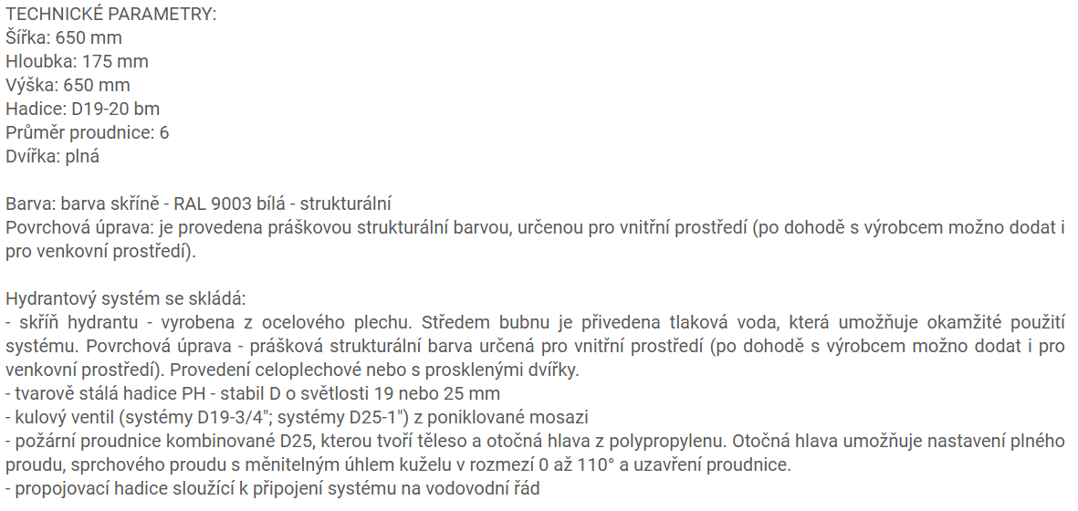 Hydrantový systém můžete mít v nerezovém provedení. Pokud potřebujete uskladnit požární hadici či hasicí přístroj, pořiďte si hydrantový box či skříň. Všechny naše produkty splňují bezpečnostní normy, a proto se můžete spolehnout na jejich bezchybnou funkčnost. Povrchová úprava je provedena práškovou strukturální barvou, určenou pro vnitřní prostředí (po dohodě s výrobcem možno dodat i pro venkovní prostředí).