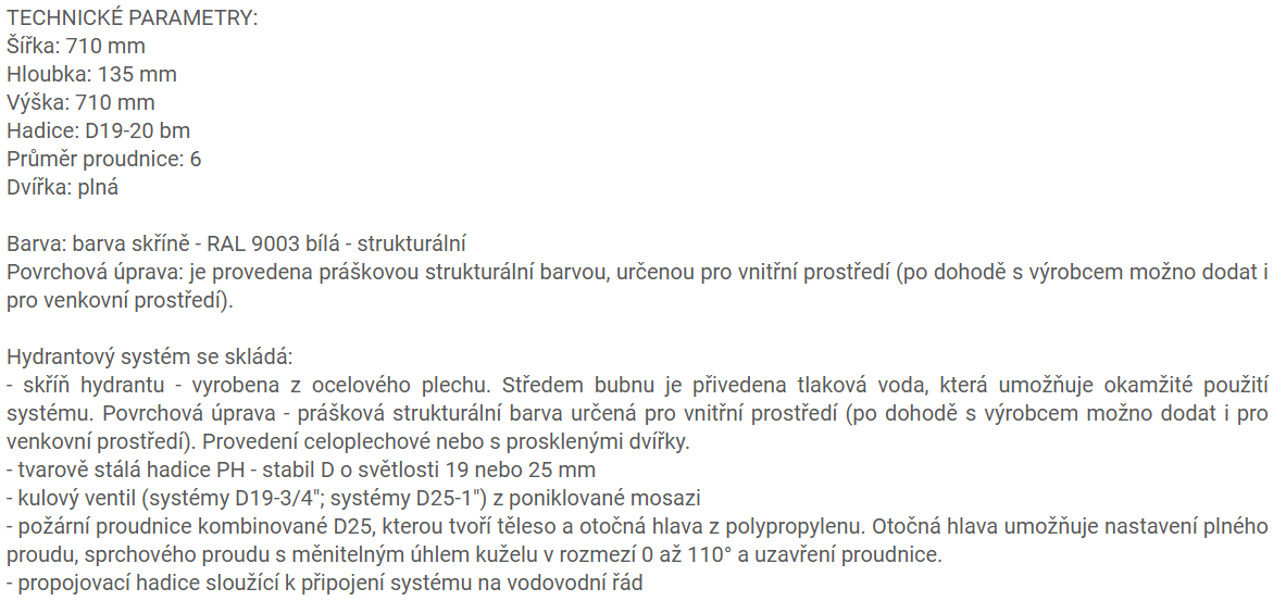 Hydrantový systém můžete mít v nerezovém provedení. Pokud potřebujete uskladnit požární hadici či hasicí přístroj, pořiďte si hydrantový box či skříň. Všechny naše produkty splňují bezpečnostní normy, a proto se můžete spolehnout na jejich bezchybnou funkčnost. Povrchová úprava je provedena práškovou strukturální barvou, určenou pro vnitřní prostředí (po dohodě s výrobcem možno dodat i pro venkovní prostředí).