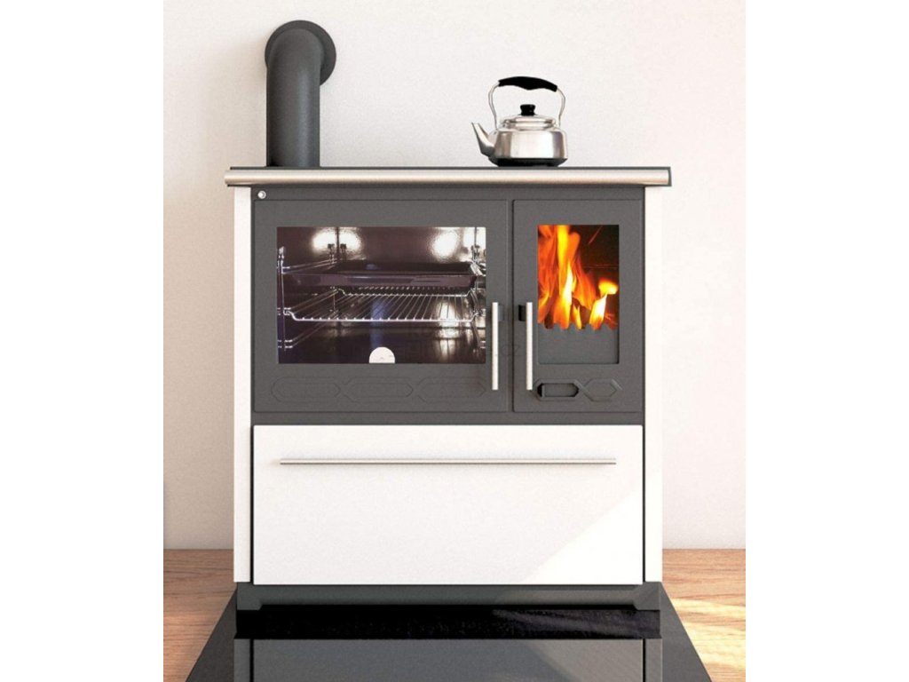 Můžete vařit přímo nad plamenem po odstraněním kroužku v horní části sporáku. Vpravo nahoře se nachází pečicí prostor a přípojka kouřovodu 120 mm. Kouřovod lze použít i vpravo vzadu. Kouřovody lze čistit bez demontáže kouřovodu.