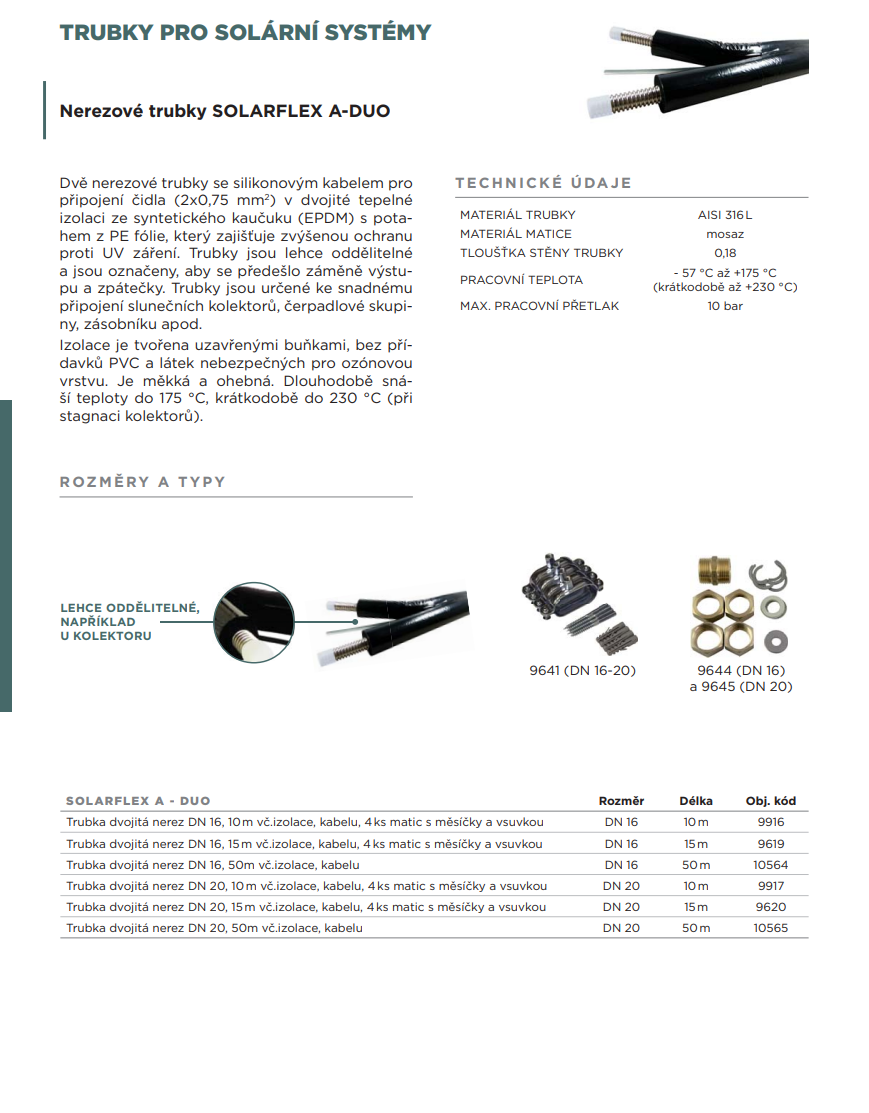 Dvě nerezové trubky se silikonovým kabelem pro připojení čidla (2x0,75 mm2) v dvojité tepelné izolaci tl. 13 mm ze syntetického kaučuku (EPDM) s potahem z PE fólie, který zajišťuje zvýšenou ochranu proti UV záření. Trubky jsou určené ke snadnému připojení slunečních kolektorů, čerpadlové skupiny, zásobníku apod. Včetně 4 ks matic s měsíčky a pertlovacím niplem.