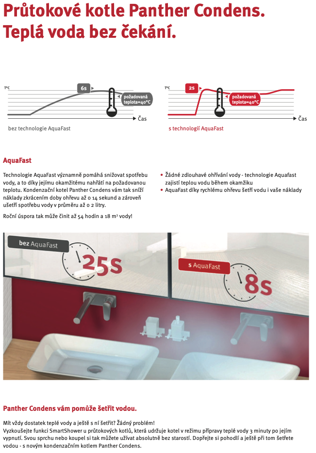 Nový kondenzační kotel Panther Condens vám zaručí příjemně teplou sprchu. Díky funkci SmartShower, která udrží konstantní teplotu vody i po jejím krátkém vypnutí, se můžete v klidu namydlit a pokračovat ve sprchování. Teplota vody se nezmění a vy nebudete muset plýtvat vodou při čekání, než se ohřeje na příjemnou teplotu.
