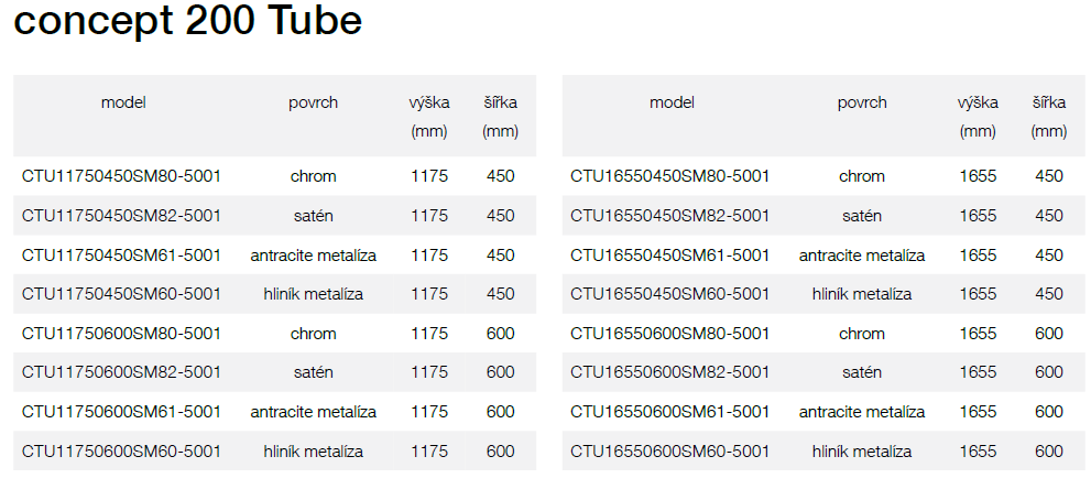 RADIÁTOR 200 TUBE koupelnový 1175/450, středové připojení