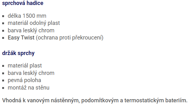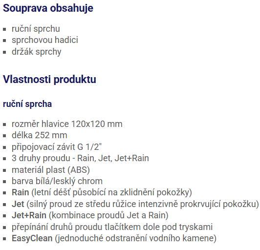| Typ: | sprchová hlavice s hadicí a držákem |