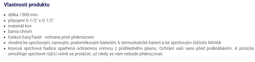 | Vlastnosti sprchové hadice: | ochrana proti překroucení |
