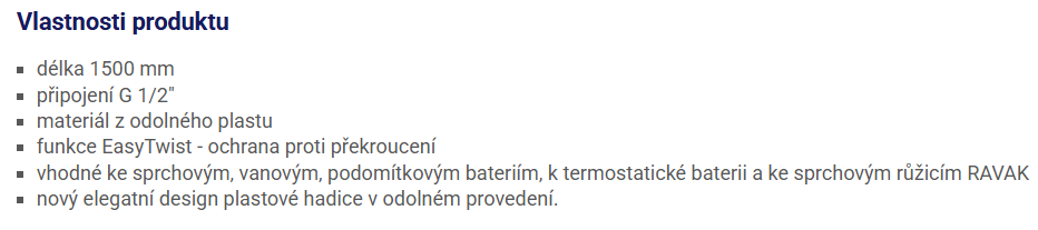 | Vlastnosti sprchové hadice: | ochrana proti překroucení |