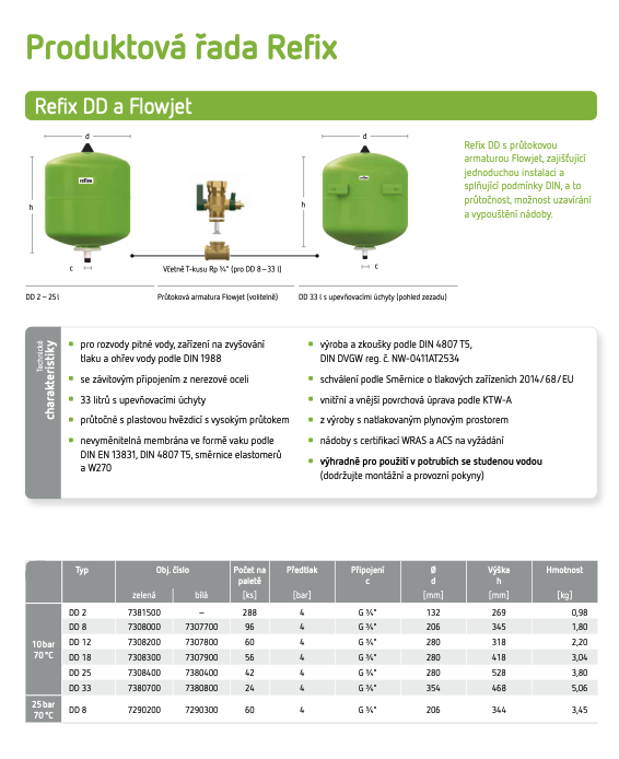 Refix DD je speciální nádoba pro pitnou vodu a je vhodná pro spojení s ohřívači teplé vody. Nádoba je průtočná s nerezovým připojením a plní tak nejvyšší hygienické požadavky.