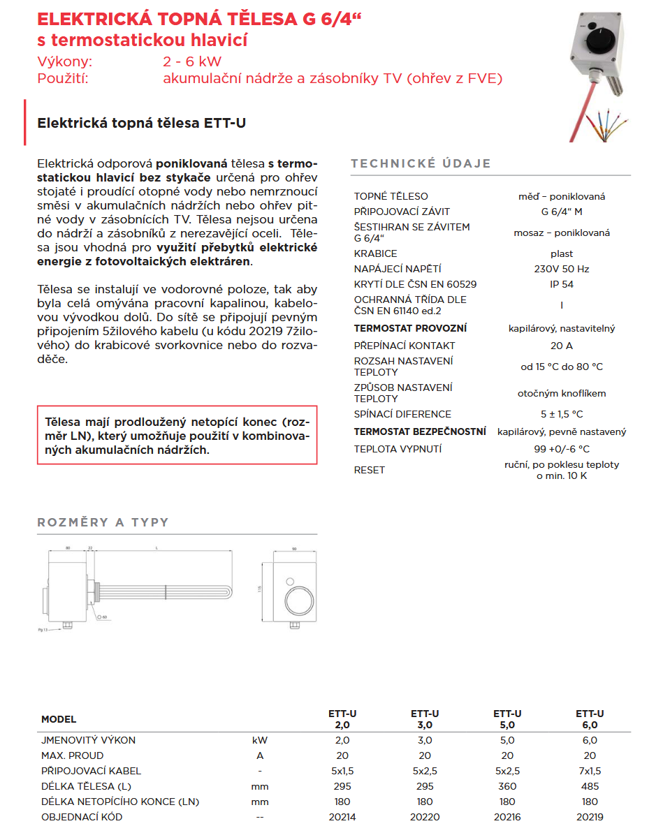 Elektrické topné těleso G 6/4" s termostatickou hlavicí 3x230V s provozním a havarijním termostatem, bez kabelu, s delším netopícím koncem, vhodné do otopné i pitné vody (zapojení do hvězdy).