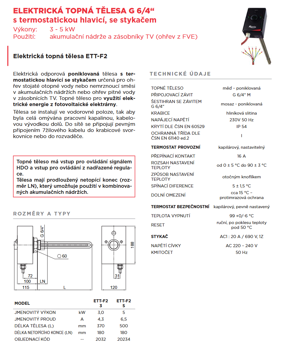 Topné těleso s termostatickou hlavicí, nastavitelné knoflíkem v rozsahu 0-90°C, délka netopícího konce 180 mm. Zapojení do hvězdy. Těleso je určeno pro využití přebytků
