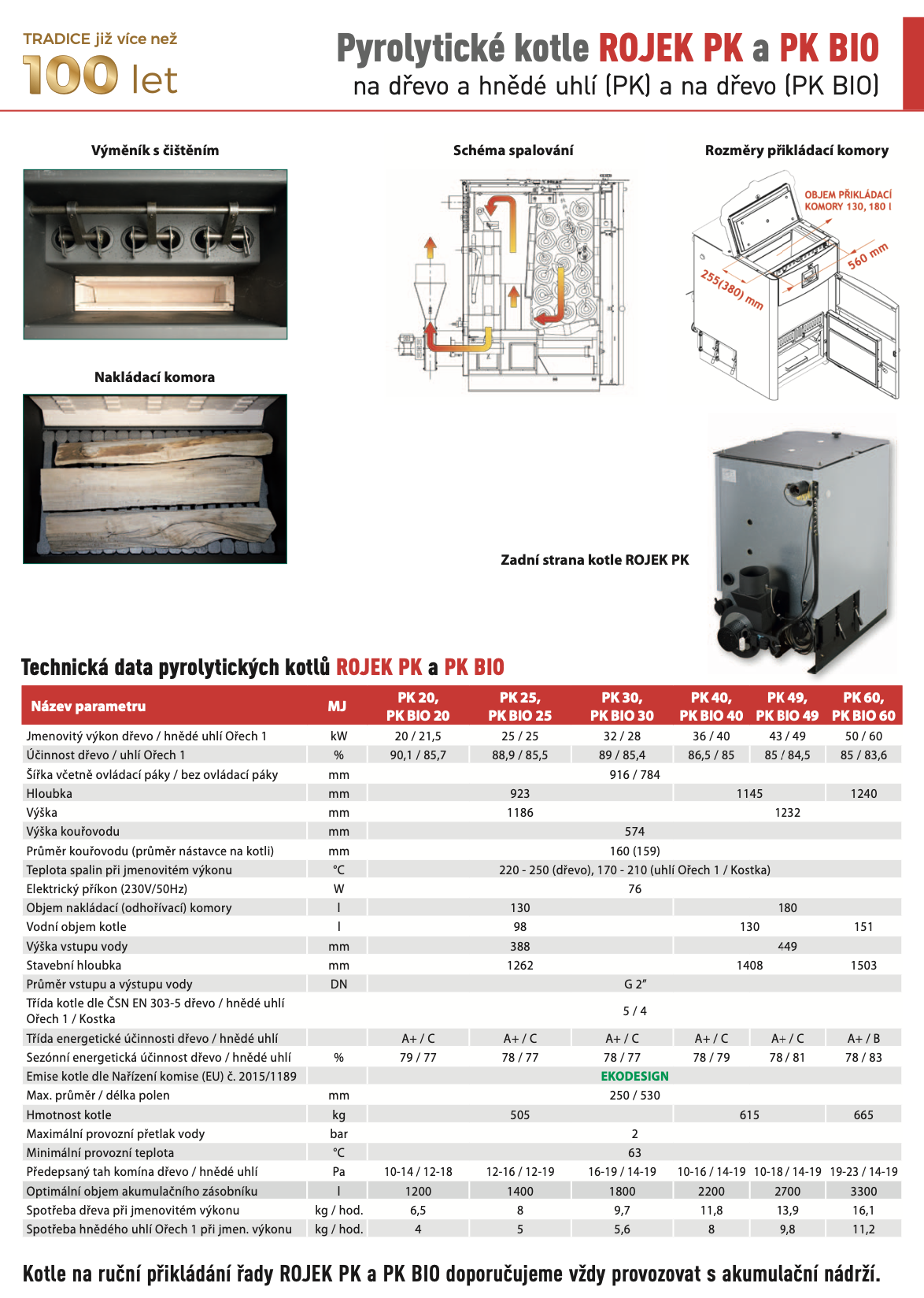 Pyrolytický kotel ROJEK PK 20 na ruční přikládání je určen ke spalování palivového dřeva - kusové dřevo o délce 530 mm, vlhkost paliva do 20 %, výhřevnost 14 - 18 MJ/kg, nebo hnědého uhlí Ořech 1 (20 - 40 mm), vlhkost paliva max. do 15 %, výhřevnost 14 - 20 MJ/kg. Kotel je certifikován ve Třídě 4 na palivo hnědé uhlí a palivo dřevo dle ČSN EN 303-5. Kotlové těleso je svařeno z jakostní oceli. Všechny plochy, které jsou ve styku se spalinami jsou z plechu tl. 5 mm. Ostatní plochy jsou z plechu tl. 4 mm.