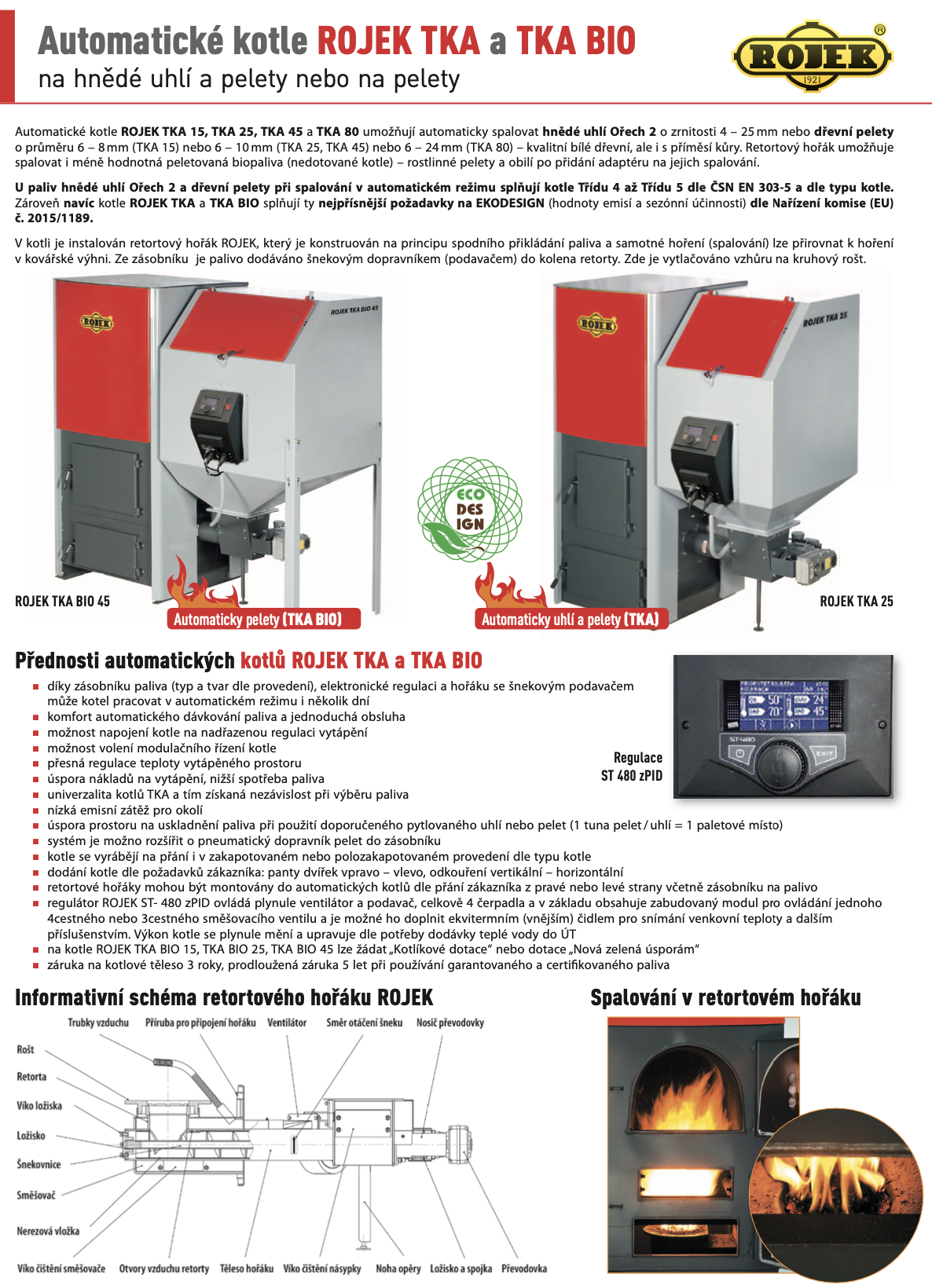 Automatický teplovodní kotel ROJEK TKA 15 umožňuje automaticky spalovat hnědé uhlí OŘECH 2 o zrnitosti 4 – 25 mm nebo dřevěné pelety o průměru 6 – 8 mm, kvalitní bílé, ale i s příměsí kůry. V kotli je instalován retortový hořák, který je konstruován na principu spodní dodávky paliva do spalovací části a samotné spalování připomíná hoření v kovářské výhni. Z násypky hořáku je palivo dodáváno šnekovým podavačem do litinového kolena retorty. Zde je vytlačováno vzhůru na kruhový rošt. Retorta je umístěna ve směšovači, do kterého je foukán vzduch ventilátorem. Vyhořelé palivo - popel a struska - přepadávají přes okraje roštu do popelníku.