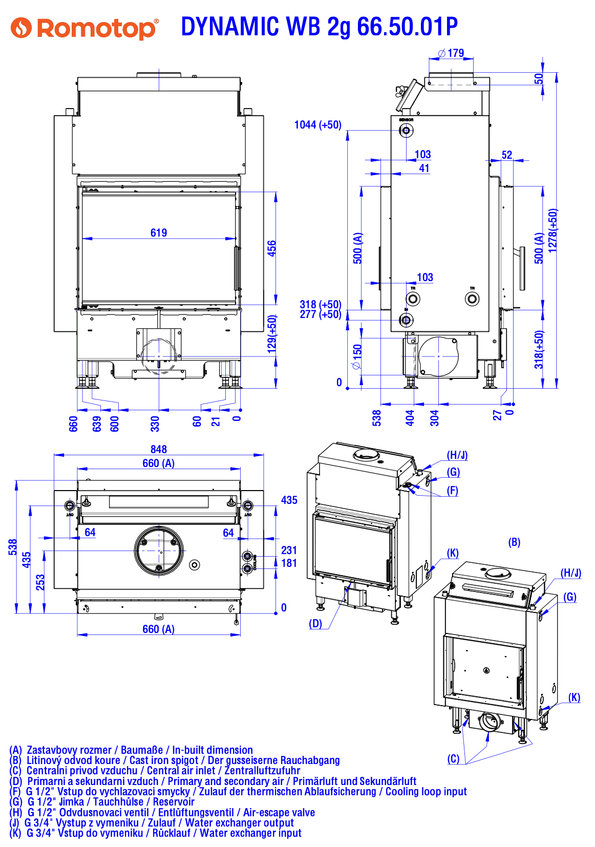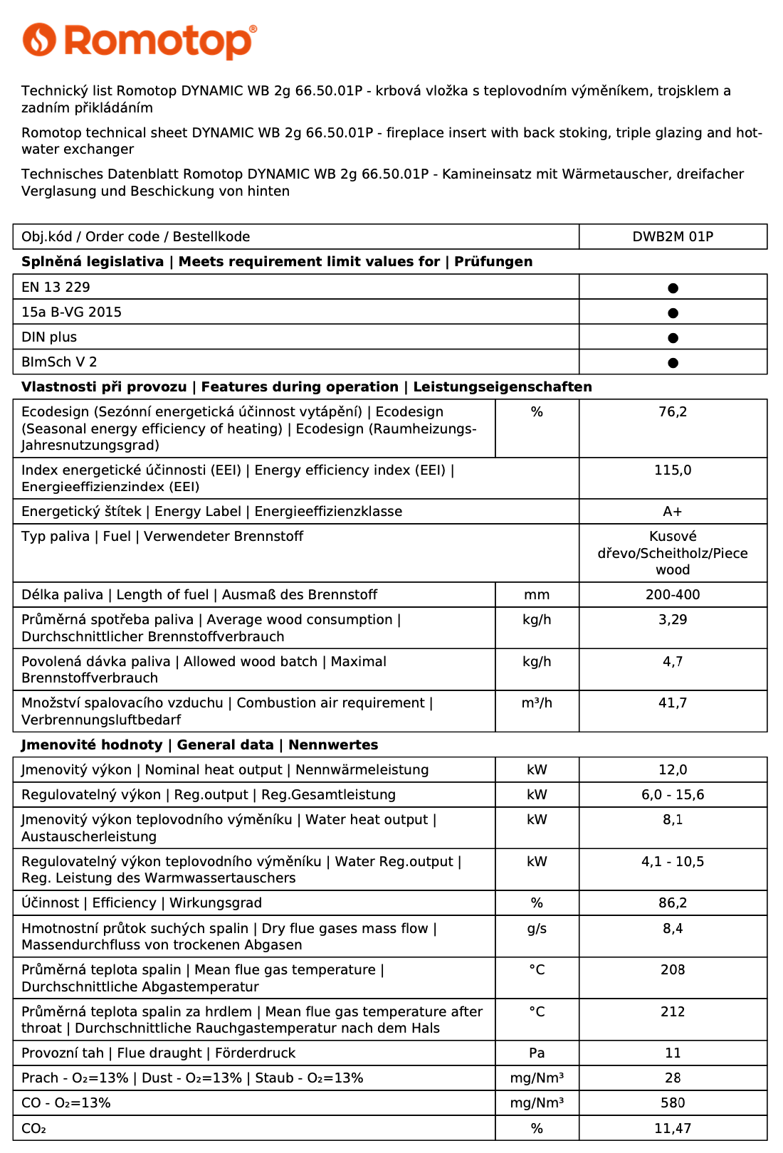ROMOTOP DYNAMIC WB 2G 66.50.01P krbová vložka 6,0-15,6kW, teplovodní s trojsklem a zadním přikládáním, černá