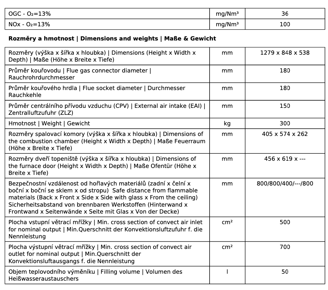 Objem výměníku je 50 l. Vložky disponují systémem CPV – centrální přívod externího vzduchu a jsou určeny jak pro akumulační, tak i pro konvekční provoz. Spalovací komora je vyložena šamotovými tvarovkami, dno je podloženo izolačními deskami a výklopným litinovým roštem s popelníkem. Díky sekundárnímu přívodu vzduchu je sklo dvířek omýváno a tak nedochází k usazování nečistot.