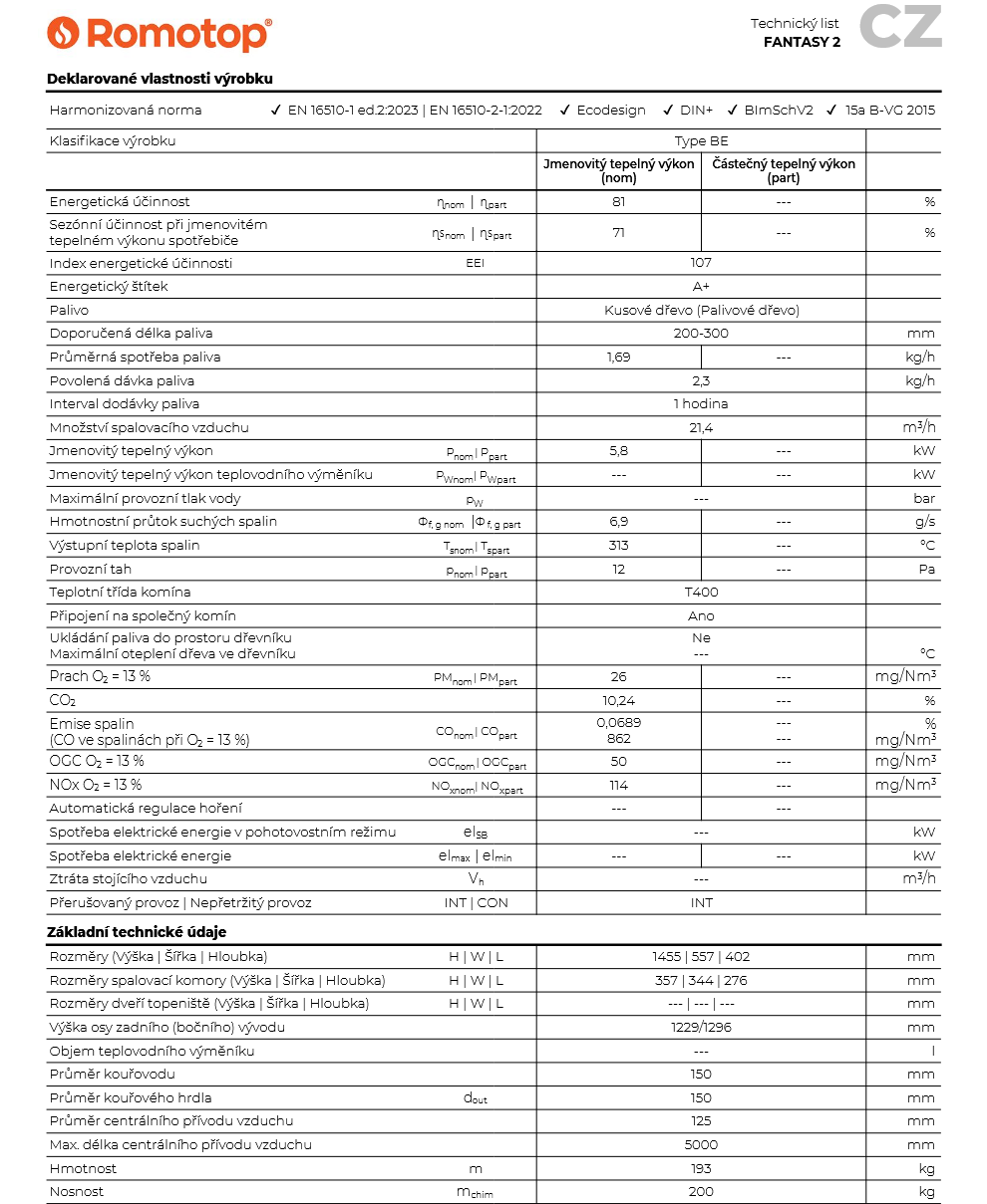 | Průměrná spotřeba dřeva: | 1,6 kg/h |