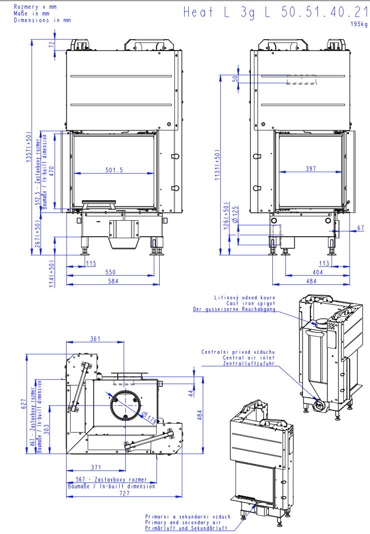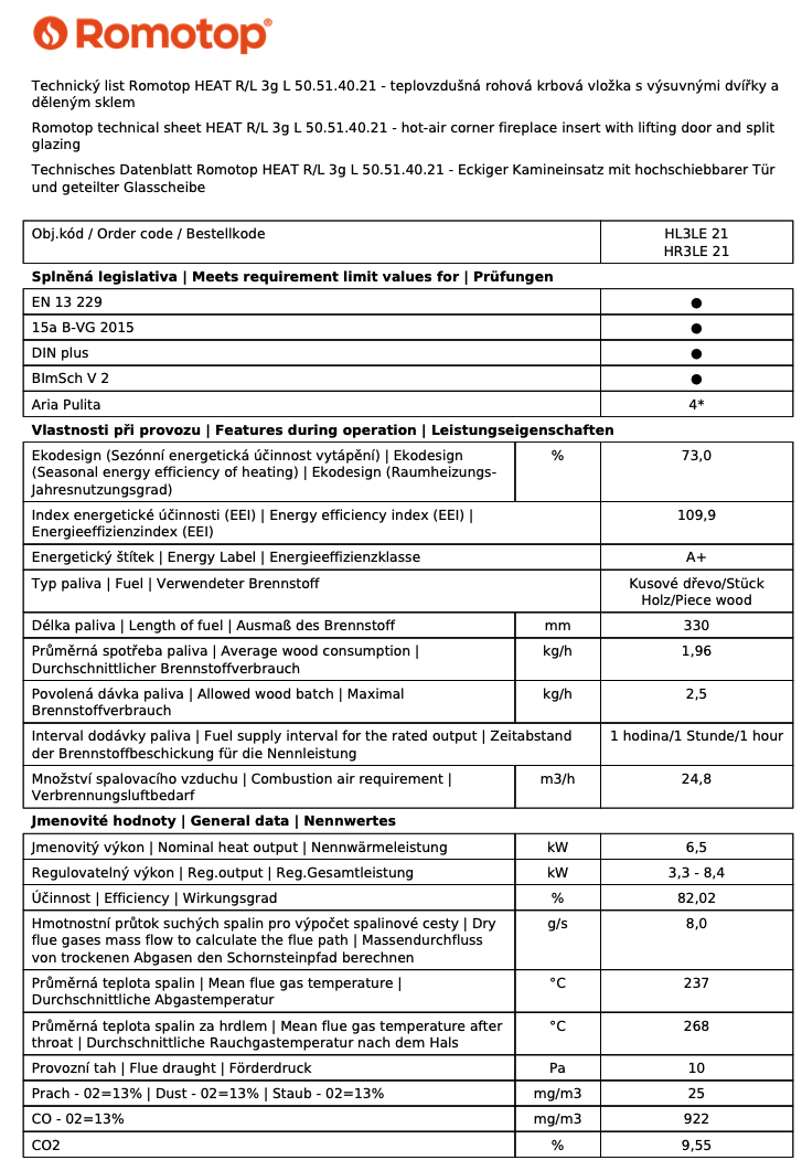 ROMOTOP HEAT L 3G L 50.51.40.24 krbová vložka 3,5-9kW, s výsuvnými dvířky