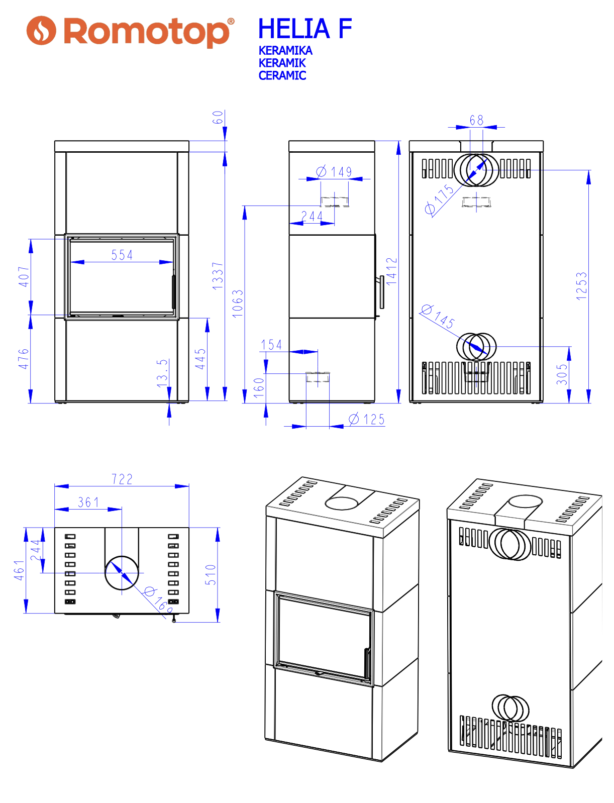 Keramický obklad krbu je na třech pohledových stranách. Kachlové krby HELIA jsou nabízeny s topeništěm rovným nebo rohovým v levém a pravém provedení. Hodí se i pro nízkoenergetické domy. Spalovací komora je vyložena šamotovými tvarovkami, ve standardním provedení s roštem s možností změny na variantu bez roštu. Inovativní systém vedení spalin DOUBLE SPIN zvyšuje celkovou účinnost krbu. Výstup spalin je standardně možný horním nebo zadním odvodem.