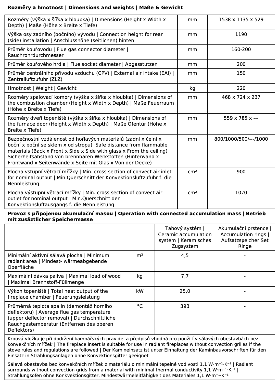Díky sekundárnímu přívodu vzduchu je sklo dvířek omýváno a tak nedochází k usazování nečistot. Regulaci primárního a sekundárního přívodu vzduchu lze řídit jediným ovládacím prvkem. Vložka disponuje systémem CPV – centrální přívod externího vzduchu, který lze pohodlně napojit pomocí otočného kolene AIRBOX. Napojení odvodu spalin z boční nebo horní strany. Ke krbovým vložkám je možné dokoupit boční a horní akumulační sady MAMMOTH, které prodlouží dobu sálání tepla o více než 12 h.