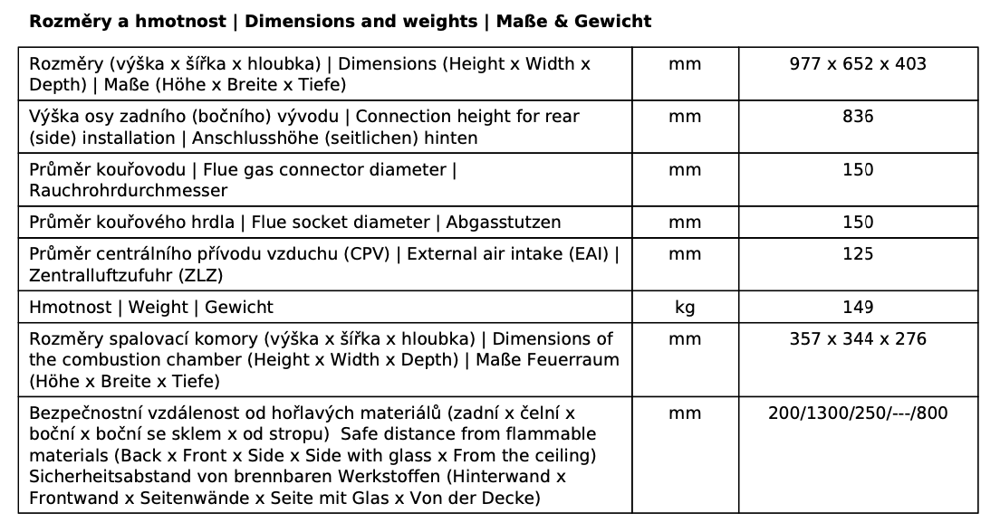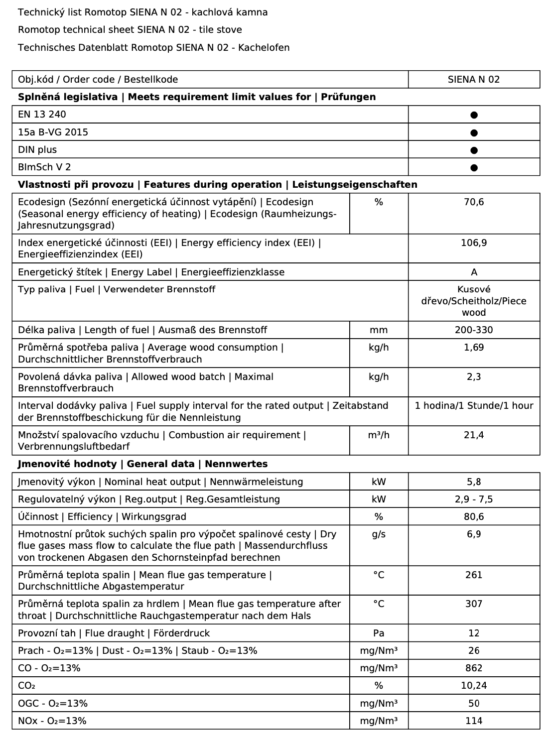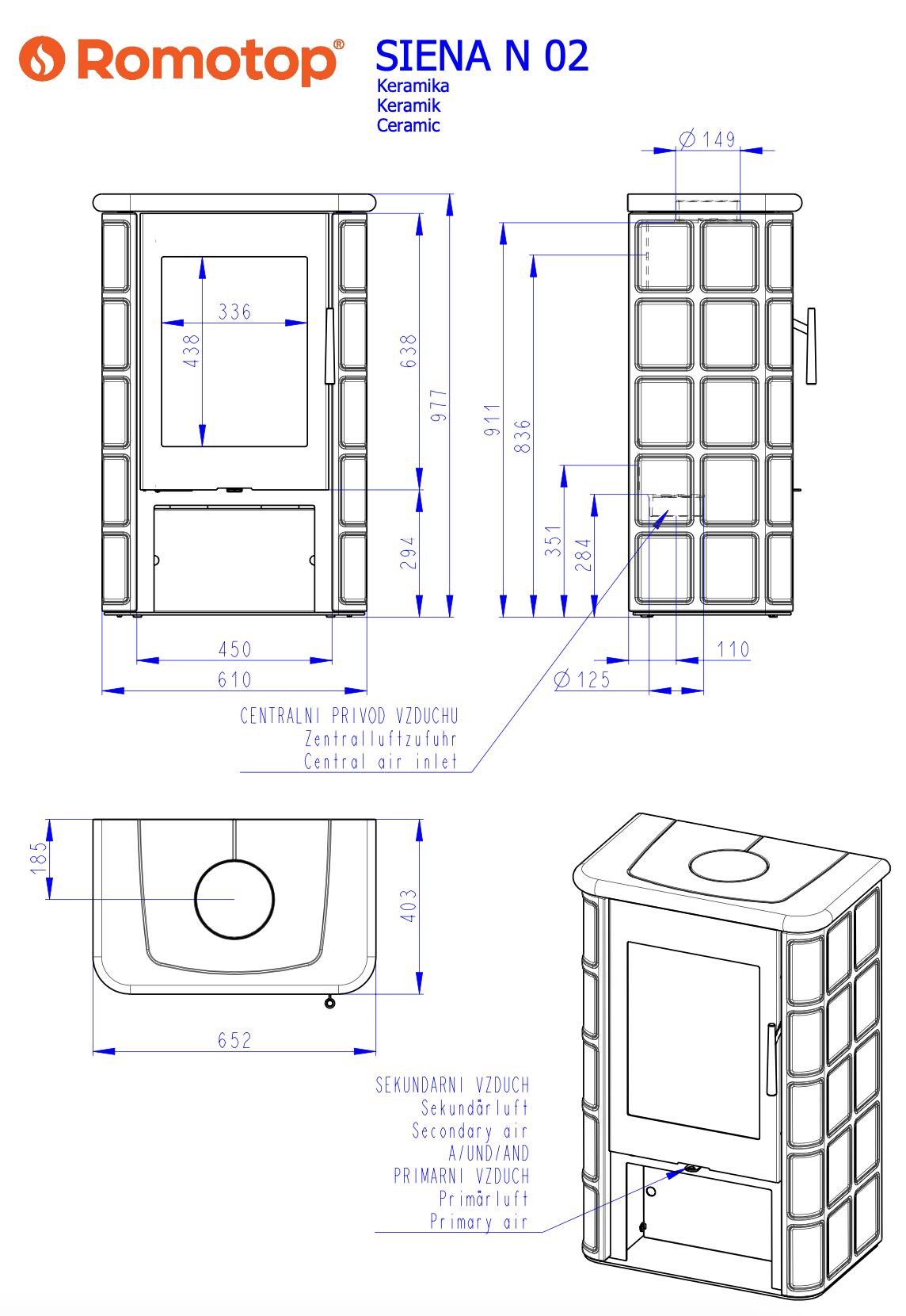Kachlová kamna jsou vhodná i do nízkoenergetických staveb. Díky centrálnímu přívodu externího vzduchu CPVdo topeniště není spotřebováván vzduch z interiéru. Konstrukce kamen umožňuje zapojení horního nebo zadního odvodu spalin. Sklo dvířek je na vnitřní straně oplachováno přívodem sekundárního vzduchu a zabraňuje tak usazování nečistot. Spalovací komora je vyložena šamotovými tvarovkami. Regulace primárního a sekundárního přívodu vzduchu se ovládá jediným ovládacím prvkem.