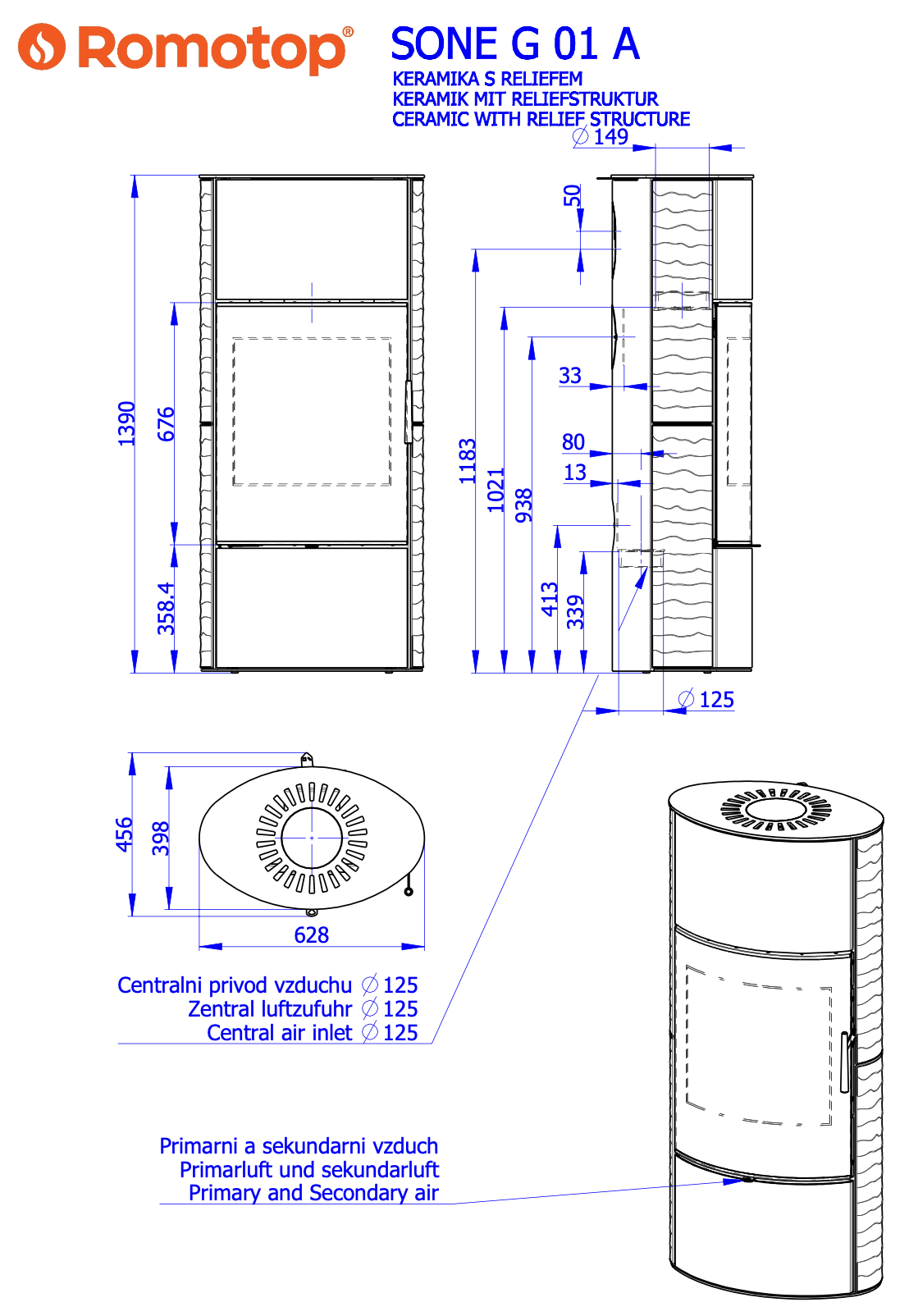 ROMOTOP SONE G 01 AKUM krbová kamna 3-7,8kW, keramika s reliéfem, bílá lesklá