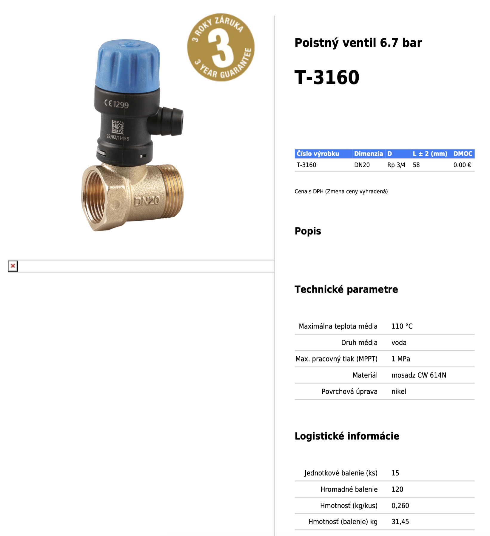 SLOVARM T-3160 pojistný ventil DN20, 3/4", 6,7 bar, pro elektrické a kombinované ohřívače, závitový, voda, mosaz