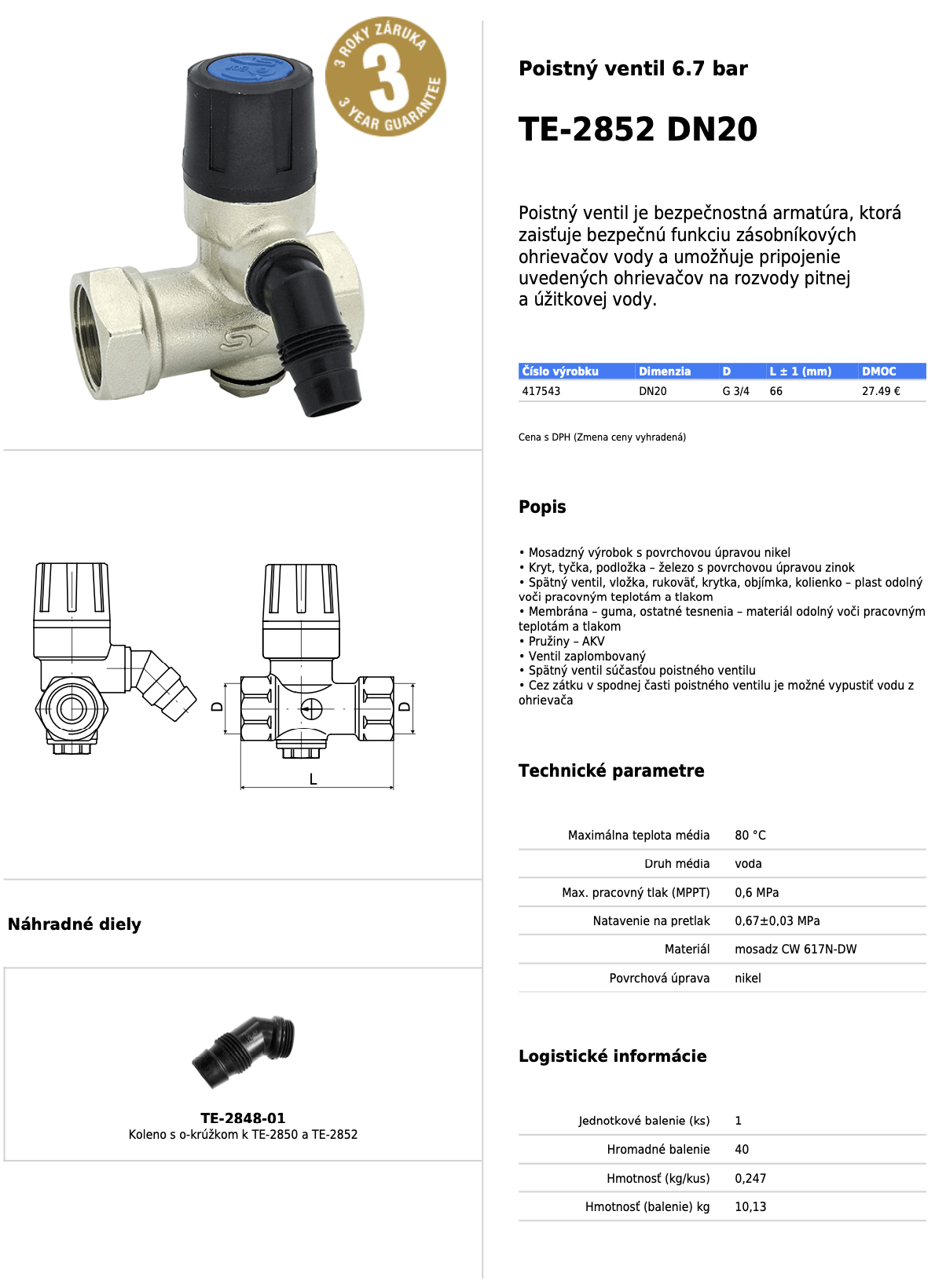 SLOVARM TE2852 pojistný ventil DN20, 6bar, pro elektrické ohřívače, vnitřní závit, voda, mosaz