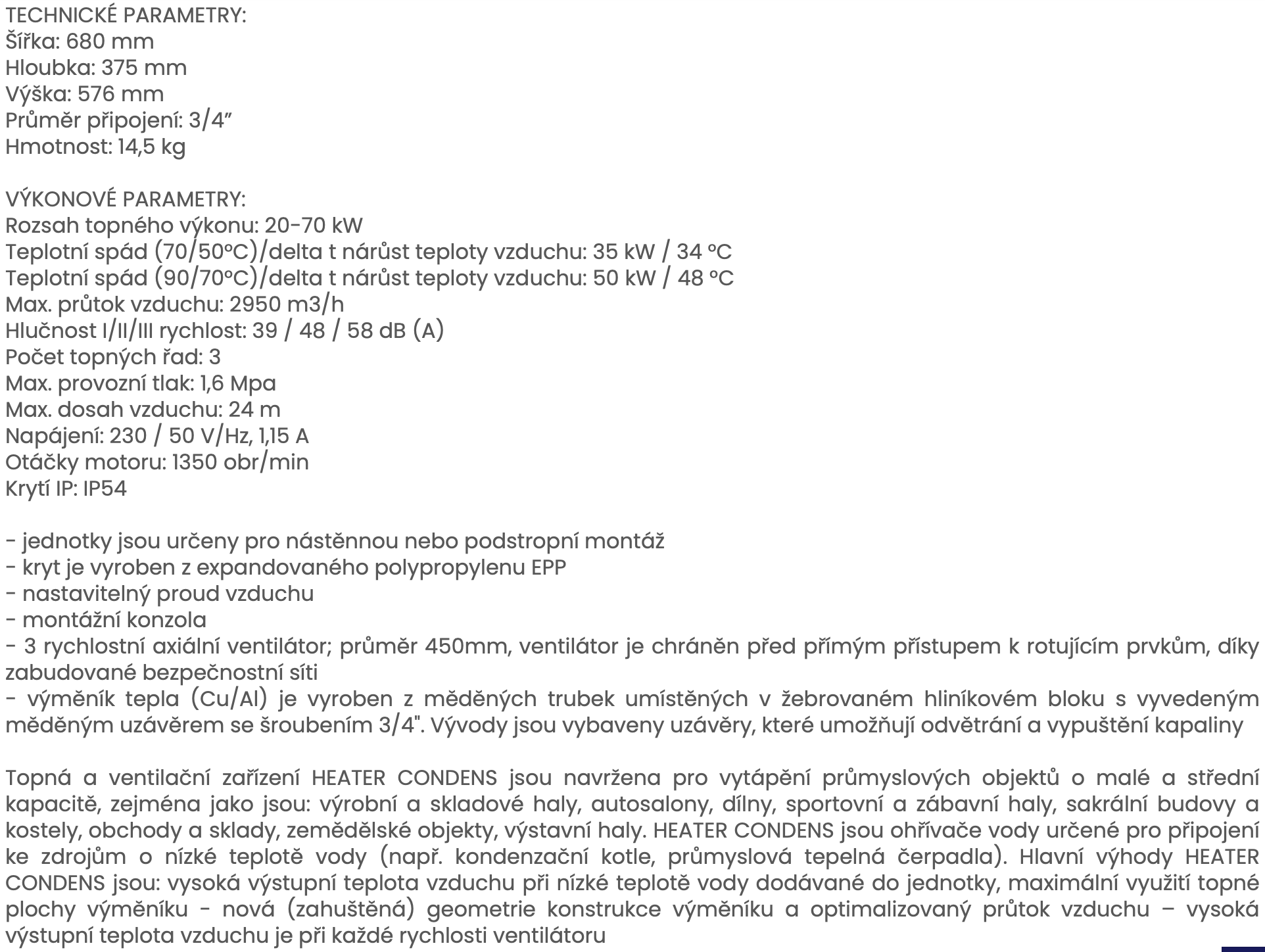 Hlavní výhody HEATER CONDENS jsou: vysoká výstupní teplota vzduchu při nízké teplotě vody dodávané do jednotky, maximální využití topné plochy výměníku - nová (zahuštěná) geometrie konstrukce výměníku a optimalizovaný průtok vzduchu – vysoká výstupní teplota vzduchu je při každé rychlosti ventilátoru