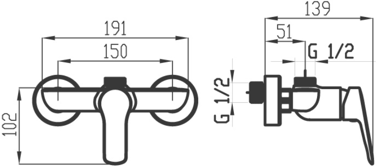 Sprchová nástěnná baterie s horním vývodem 1/2" bez příslušenství s roztečí 150 mm.