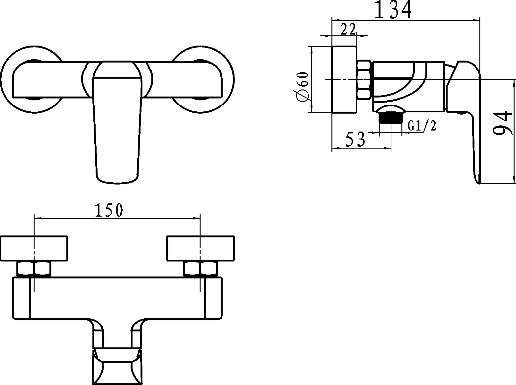 Sprchová nástěnná baterie s roztečí 150 mm se spodním vývodem vody.