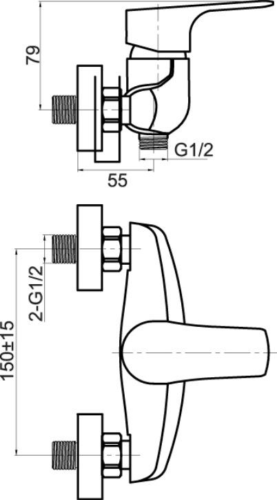 Sprchová nástěnná baterie se spodním vývodem s roztečí 150 mm.