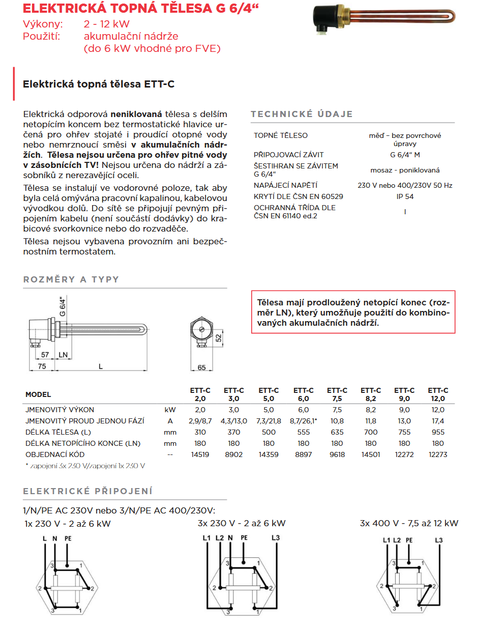 Elektrická odporová neniklovaná tělesa s delším netopícím koncem bez termostatické hlavice určená pro ohřev stojaté i proudící otopné vody nebo nemrznoucí směsi v kombinovaných akumulačních nádržích. Tělesa nejsou určena do zásobníků TV! Nejsou určena do nádrží a zásobníků z nerezavějící oceli.