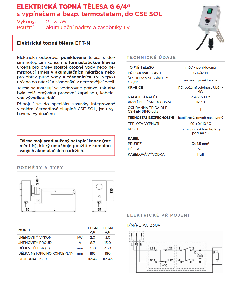 Poniklované elektrické topné těleso G 6/4" s termostatickou plastovou hlavicí 1x230 V pro připojení do solární čerp. skupiny CSE SOL, s vypínačem a dvoupólovým havarijním termostatem, 5m přívodní 3žilový kabel s konektorem, poniklované tělěso - vhodné do otopné i pitné vody, delší netopící konec pro nádrže DUO, HSK.