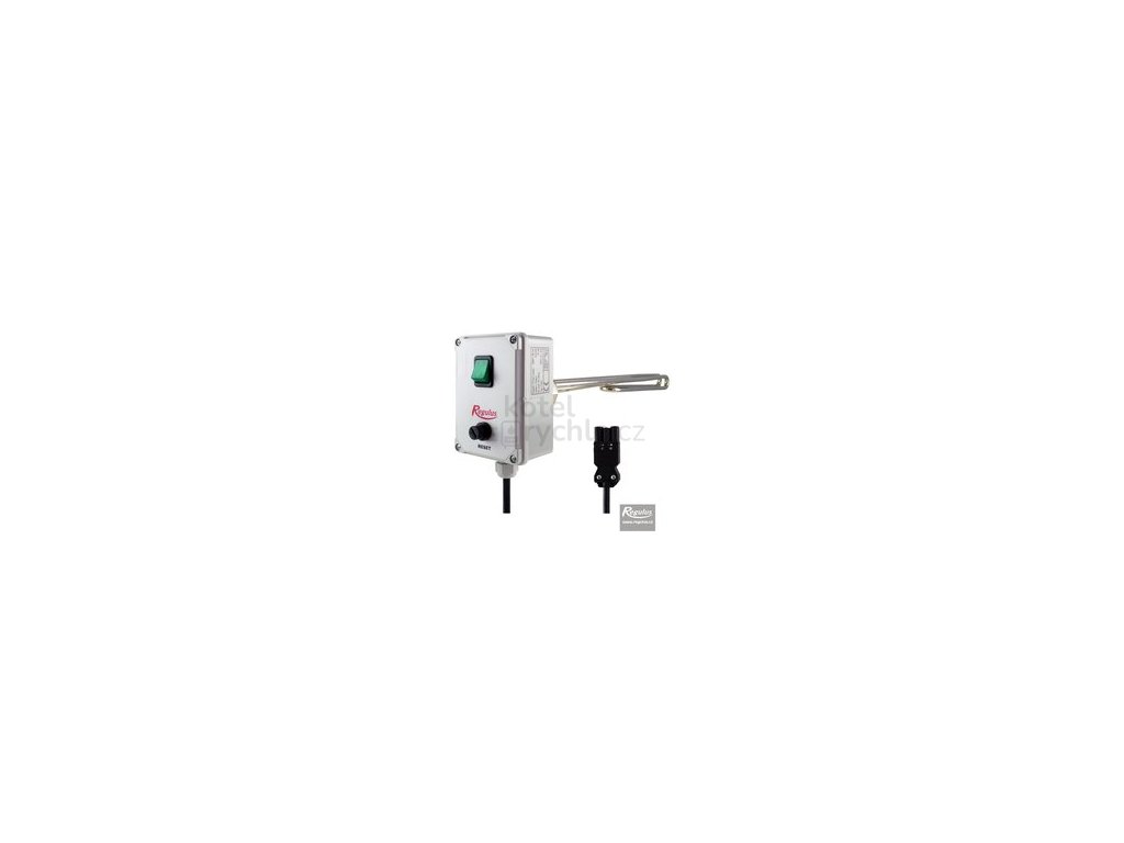 Poniklované elektrické topné těleso G 6/4" s termostatickou plastovou hlavicí 1x230 V pro připojení do solární čerp. skupiny CSE SOL, s vypínačem a dvoupólovým havarijním termostatem, 5m přívodní 3žilový kabel s konektorem, poniklované tělěso - vhodné do otopné i pitné vody, delší netopící konec pro nádrže DUO, HSK.